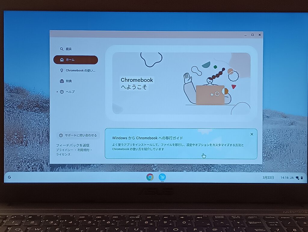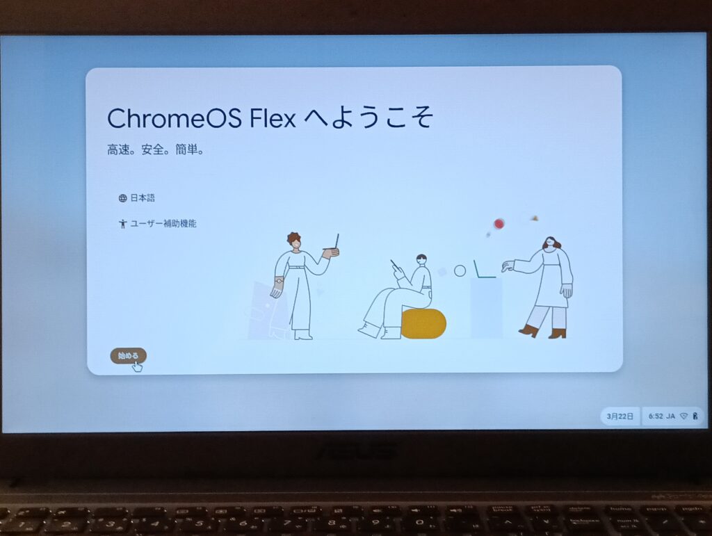 3.「ChromeOS Flexへようこそ」と表示されたら、画面に従って進めるだけ。